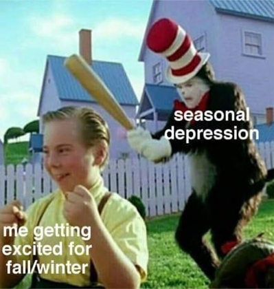 The name may seem like a joke but it’s really a lot more troublesome than it sounds. Seasonal Affect Disorder is a type of depression that occurs due to changes in weather patterns and climate that adversely affects certain individual’s mental health. Bleh. That’s the more clinical explanation anyway. To put it more simply, when the dark/cold times come some of us get sad (hey that works both ways). It’s more than that though. Depression in and of itself is not something to be taken lightly. People can experience a myriad of symptoms including fluctuations in appetite and sleep, low motivation, memory issues, irritability, avoidance behaviors and so on. These are also things someone may not normally deal with during the rest of the year as well. Or the severity of their symptoms increases and becomes unmanageable. It’s a big spectrum that can present differently in each person.